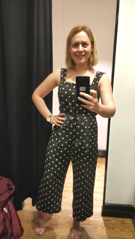 When I went shopping in Oxford with my bestie Chloe, it was quite refreshing to try on things I’d have never considered before – she pushed me out of my normal comfort zone. ESPECIALLY when it comes to jumpsuits. This jumpsuit was everything I’d usually avoid: culotte length, black and a square neckline. As soon as I put it on, I pulled a face. Ugh. No. Not for me. But Chloe’s reaction to it was the total opposite! She thought it looked great, and lots of you did too. I couldn’t believe how many Insta-messages I had after posting it on my Stories saying I should have bought it! I didn’t… but it’s made me try on whole new outfits that I would never have gone near before. And it’s so much fun!